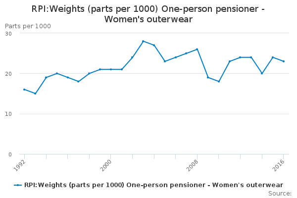 Download this time seriesRPI:Weights (parts per 1000) One-person pensioner - Women's outerwear