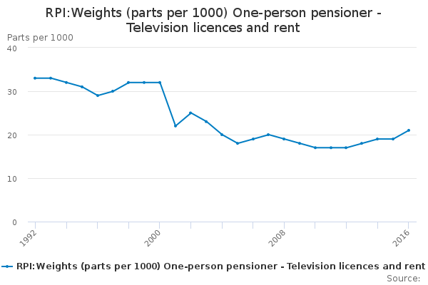 Download this time seriesRPI:Weights (parts per 1000) One-person pensioner - Television licences and rent