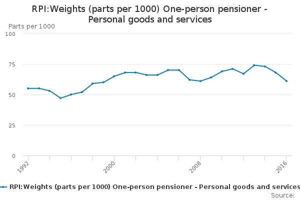 Download this time seriesRPI:Weights (parts per 1000) One-person pensioner - Personal goods and services