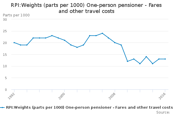 Download this time seriesRPI:Weights (parts per 1000) One-person pensioner - Fares and other travel costs