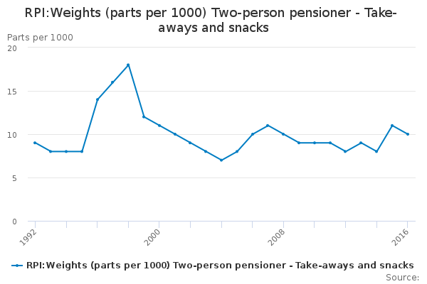 Download this time seriesRPI:Weights (parts per 1000) Two-person pensioner - Take-aways and snacks