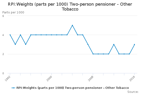 Download this time seriesRPI:Weights (parts per 1000) Two-person pensioner - Other Tobacco