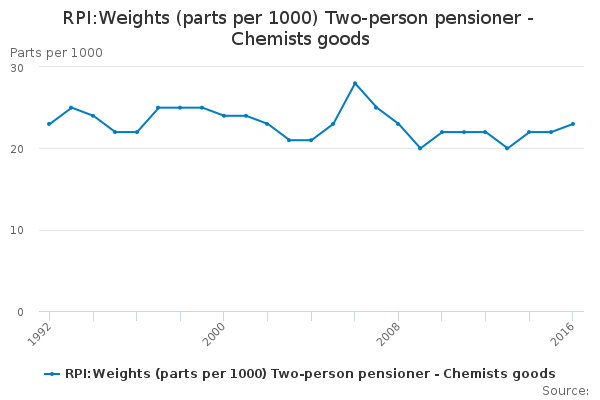 Download this time seriesRPI:Weights (parts per 1000) Two-person pensioner - Chemists goods