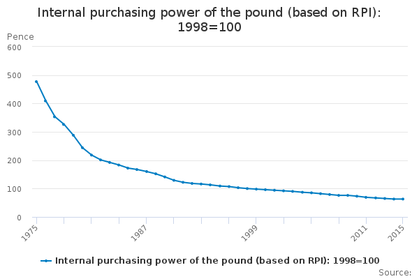 Download this time seriesInternal purchasing power of the pound (based on RPI): 1998=100