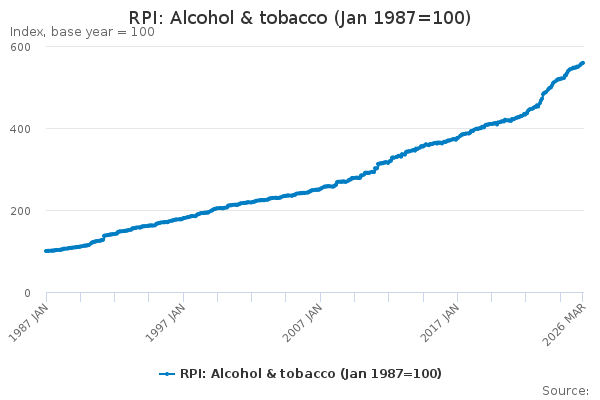 Download this time seriesRPI: Alcohol & tobacco (Jan 1987=100)