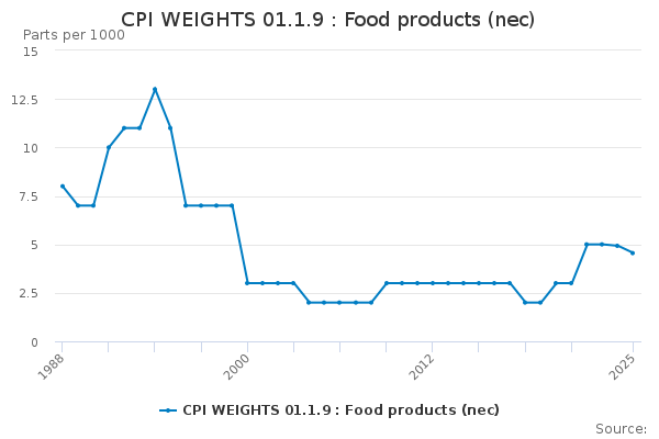 Download this time seriesCPI WEIGHTS 01.1.9 : Food products (nec)