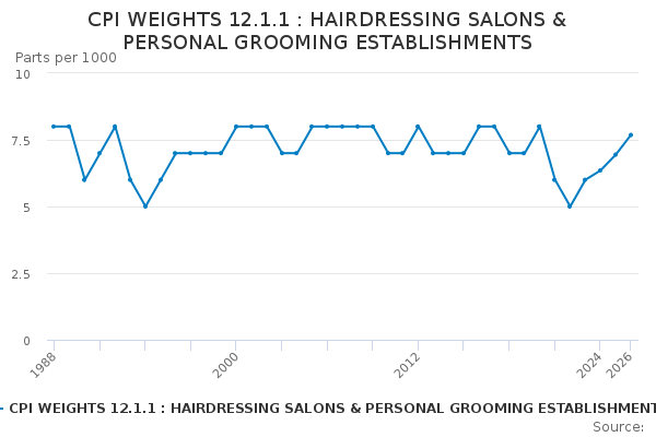 Download this time seriesCPI WEIGHTS 12.1.1 : HAIRDRESSING SALONS & PERSONAL GROOMING ESTABLISHMENTS