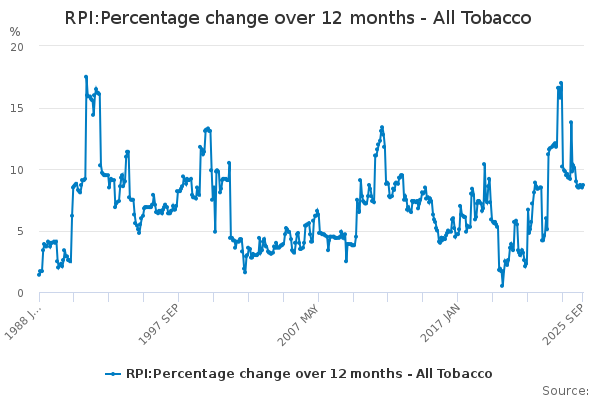 Download this time seriesRPI:Percentage change over 12 months - All Tobacco
