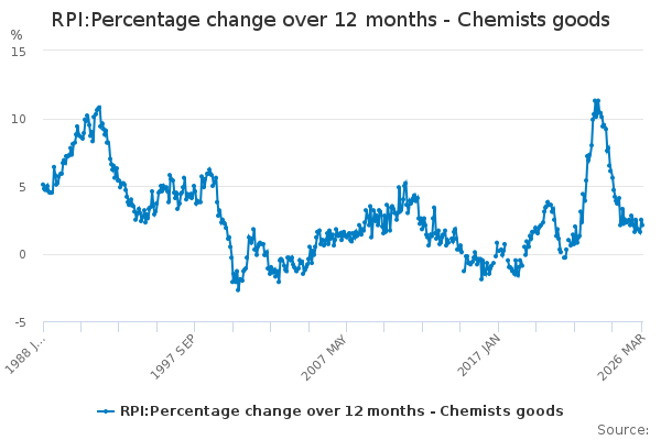 Download this time seriesRPI:Percentage change over 12 months - Chemists goods