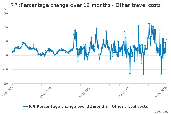 Download this time seriesRPI:Percentage change over 12 months - Other travel costs