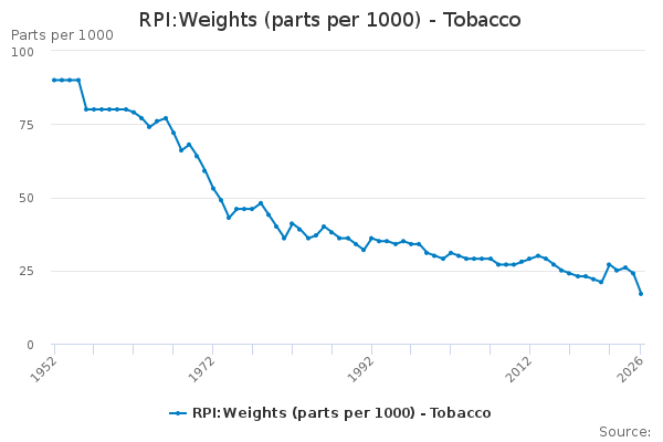 Download this time seriesRPI:Weights (parts per 1000) - Tobacco