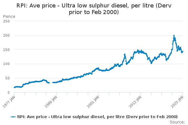 Download this time seriesRPI: Ave price - Ultra low sulphur diesel, per litre (Derv prior to Feb 2000)
