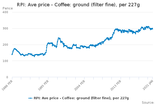 Download this time seriesRPI: Ave price - Coffee: ground (filter fine), per 227g