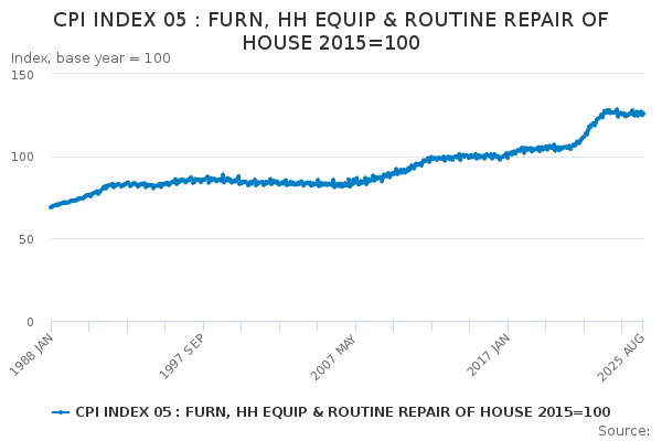 Download this time seriesCPI INDEX 05 : FURN, HH EQUIP & ROUTINE REPAIR OF HOUSE 2015=100