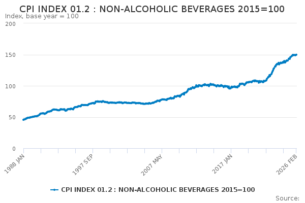 Download this time seriesCPI INDEX 01.2 : NON-ALCOHOLIC BEVERAGES 2015=100
