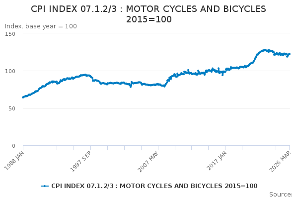 Download this time seriesCPI INDEX 07.1.2/3 : MOTOR CYCLES AND BICYCLES 2015=100