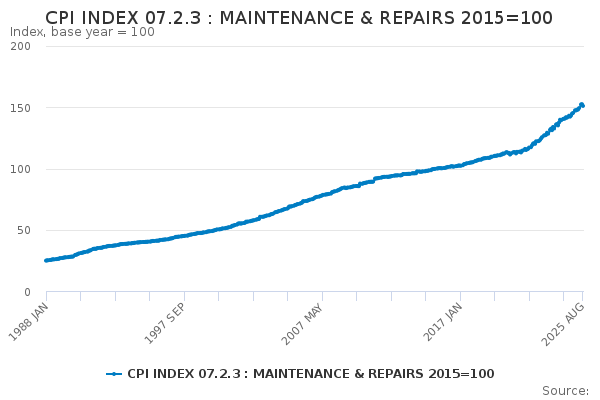 Download this time seriesCPI INDEX 07.2.3 : MAINTENANCE & REPAIRS 2015=100