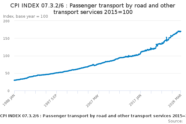 Download this time seriesCPI INDEX 07.3.2/6 : Passenger transport by road and other transport services 2015=100