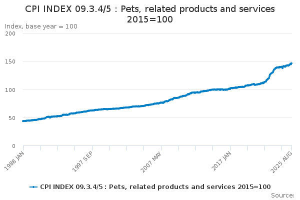 Download this time seriesCPI INDEX 09.3.4/5 : Pets, related products and services 2015=100