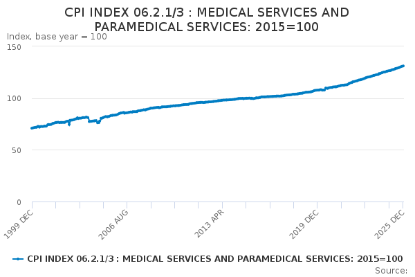 Download this time seriesCPI INDEX 06.2.1/3 : MEDICAL SERVICES AND PARAMEDICAL SERVICES: 2015=100