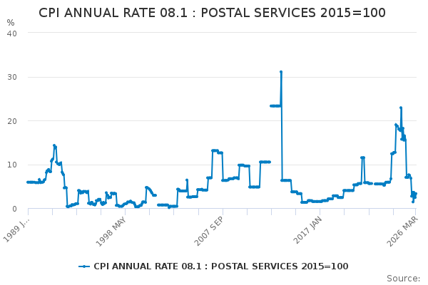 Download this time seriesCPI ANNUAL RATE 08.1 : POSTAL SERVICES 2015=100