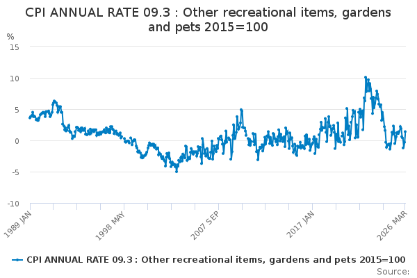 Download this time seriesCPI ANNUAL RATE 09.3 : Other recreational items, gardens and pets 2015=100