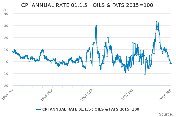 Download this time seriesCPI ANNUAL RATE 01.1.5 : OILS & FATS 2015=100
