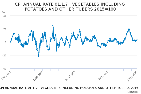 Download this time seriesCPI ANNUAL RATE 01.1.7 : VEGETABLES INCLUDING POTATOES AND OTHER TUBERS 2015=100