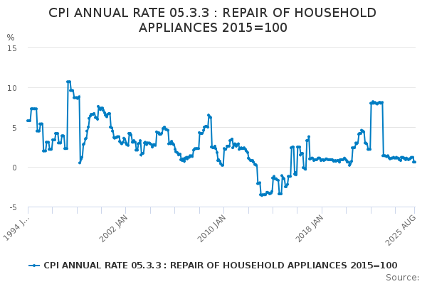 Download this time seriesCPI ANNUAL RATE 05.3.3 : REPAIR OF HOUSEHOLD APPLIANCES 2015=100