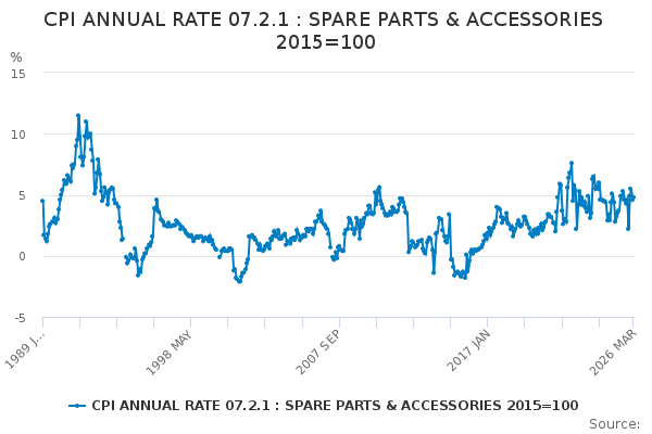 Download this time seriesCPI ANNUAL RATE 07.2.1 : SPARE PARTS & ACCESSORIES 2015=100