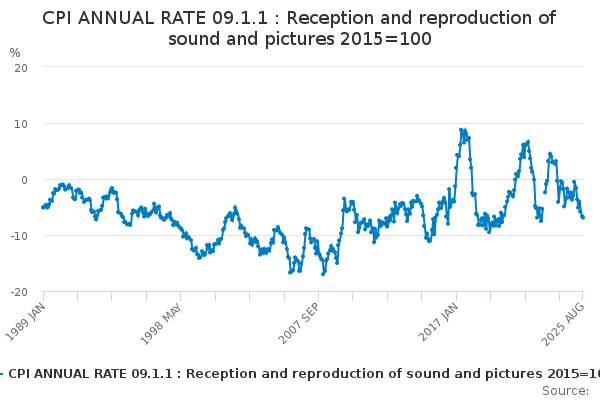 Download this time seriesCPI ANNUAL RATE 09.1.1 : Reception and reproduction of sound and pictures 2015=100