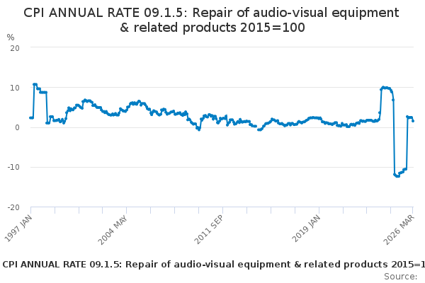 Download this time seriesCPI ANNUAL RATE 09.1.5: Repair of audio-visual equipment & related products 2015=100