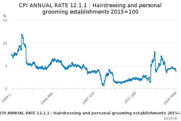 Download this time seriesCPI ANNUAL RATE 12.1.1 : Hairdressing and personal grooming establishments 2015=100