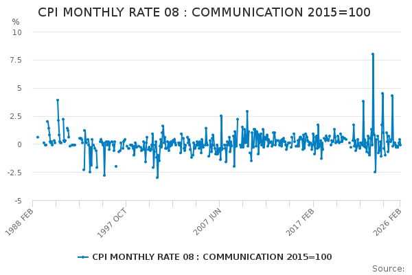 Download this time seriesCPI MONTHLY RATE 08 : COMMUNICATION 2015=100