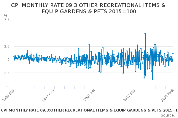 Download this time seriesCPI MONTHLY RATE 09.3:OTHER RECREATIONAL ITEMS & EQUIP GARDENS & PETS 2015=100