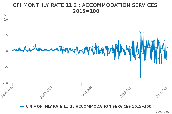 Download this time seriesCPI MONTHLY RATE 11.2 : ACCOMMODATION SERVICES 2015=100