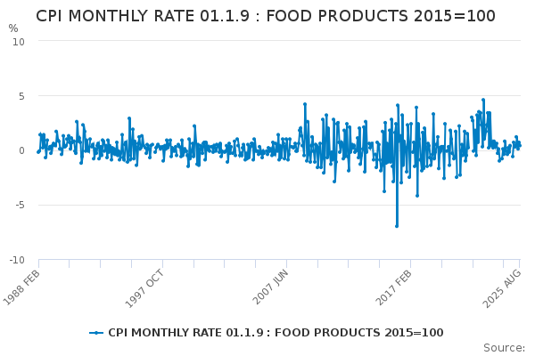 Download this time seriesCPI MONTHLY RATE 01.1.9 : FOOD PRODUCTS 2015=100