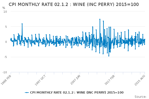 Download this time seriesCPI MONTHLY RATE 02.1.2 : WINE (INC PERRY) 2015=100