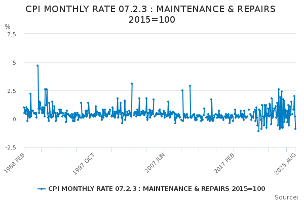 Download this time seriesCPI MONTHLY RATE 07.2.3 : MAINTENANCE & REPAIRS 2015=100