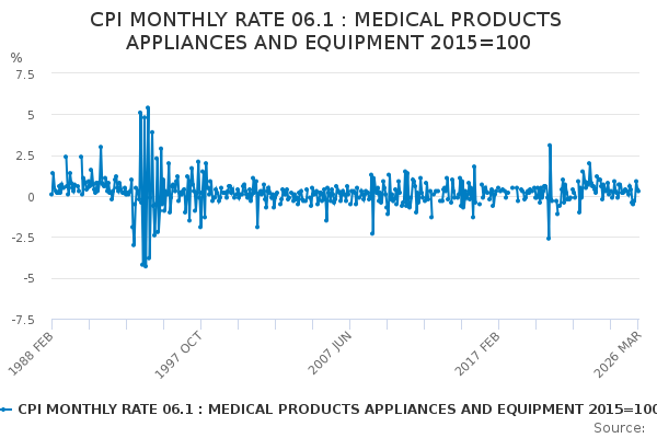 Download this time seriesCPI MONTHLY RATE 06.1 : MEDICAL PRODUCTS APPLIANCES AND EQUIPMENT 2015=100