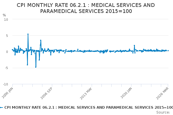 Download this time seriesCPI MONTHLY RATE 06.2.1 : MEDICAL SERVICES AND PARAMEDICAL SERVICES 2015=100