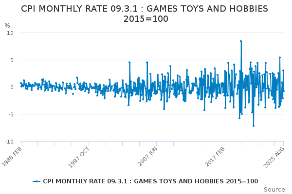 Download this time seriesCPI MONTHLY RATE 09.3.1 : GAMES TOYS AND HOBBIES 2015=100