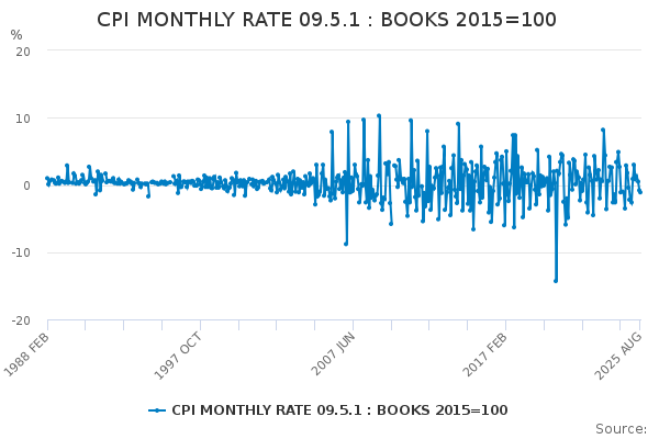 Download this time seriesCPI MONTHLY RATE 09.5.1 : BOOKS 2015=100