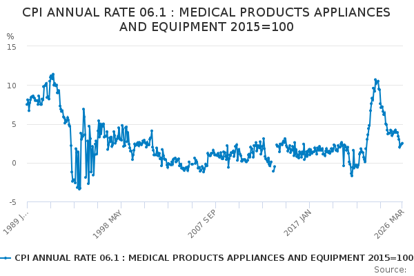 Download this time seriesCPI ANNUAL RATE 06.1 : MEDICAL PRODUCTS APPLIANCES AND EQUIPMENT 2015=100