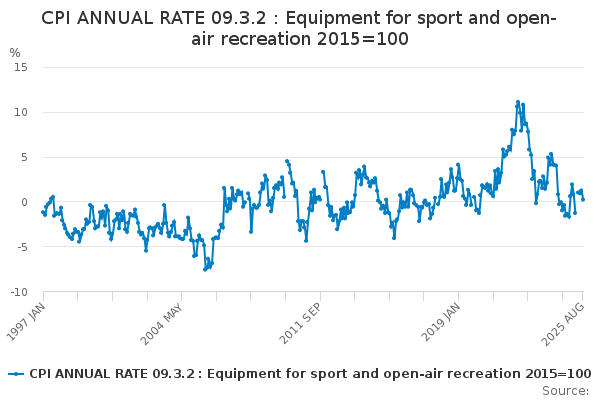 Download this time seriesCPI ANNUAL RATE 09.3.2 : Equipment for sport and open-air recreation 2015=100