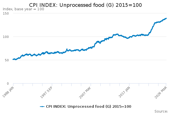 Download this time seriesCPI INDEX: Unprocessed food (G) 2015=100