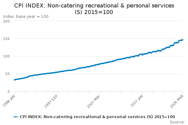 Download this time seriesCPI INDEX: Non-catering recreational & personal services (S) 2015=100