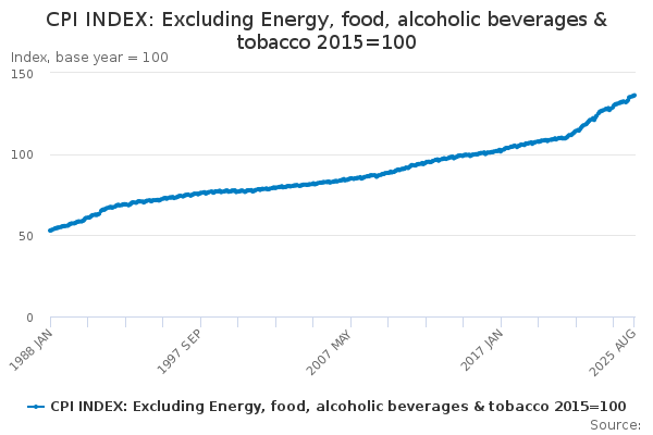 Download this time seriesCPI INDEX: Excluding Energy, food, alcoholic beverages & tobacco 2015=100