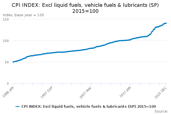 Download this time seriesCPI INDEX: Excl liquid fuels, vehicle fuels & lubricants (SP) 2015=100