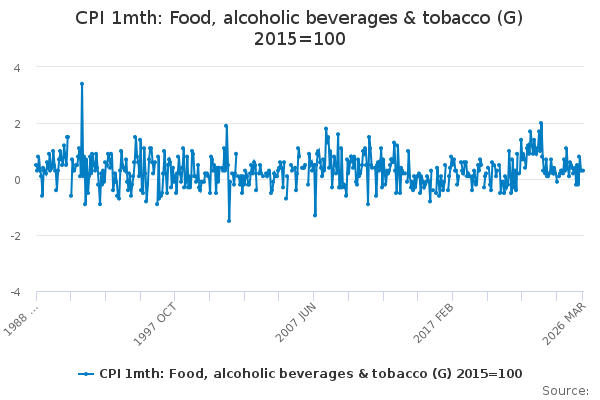 Download this time seriesCPI 1mth: Food, alcoholic beverages & tobacco (G) 2015=100